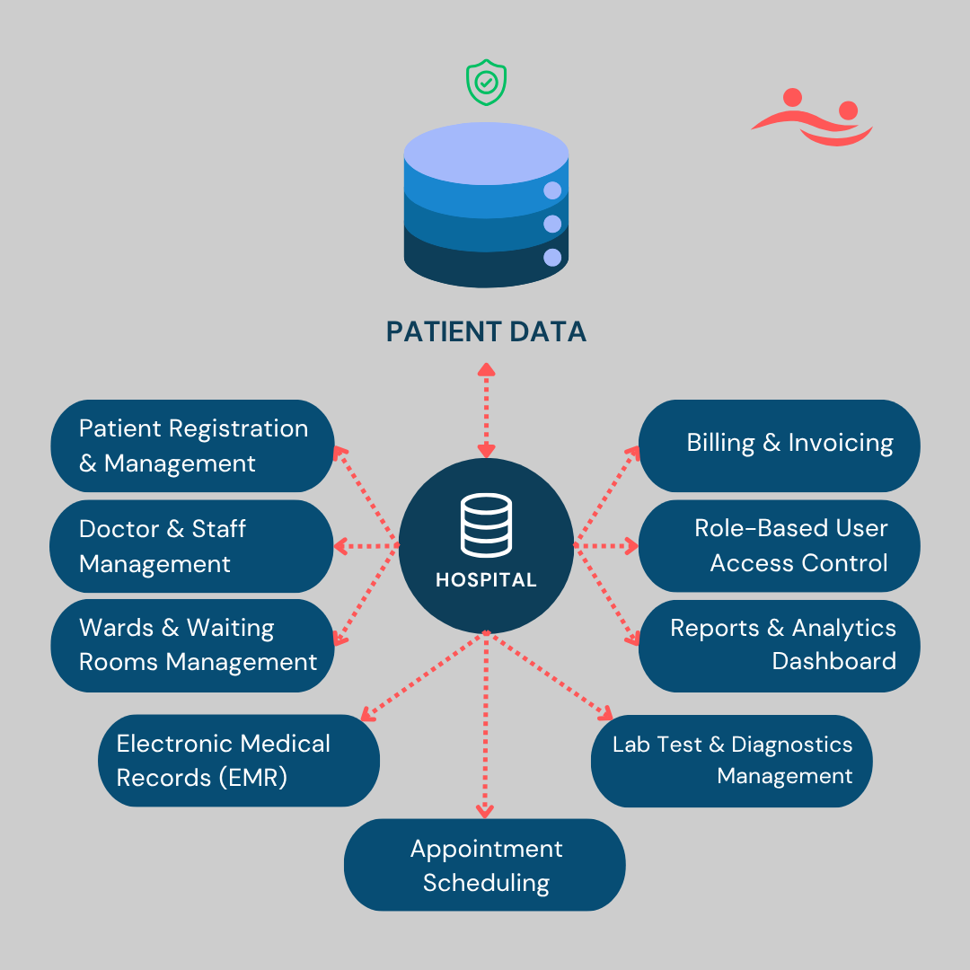 - All patient records and hospital operations are stored in one encrypted, cloud-based system — secure, compliant, and always accessible.