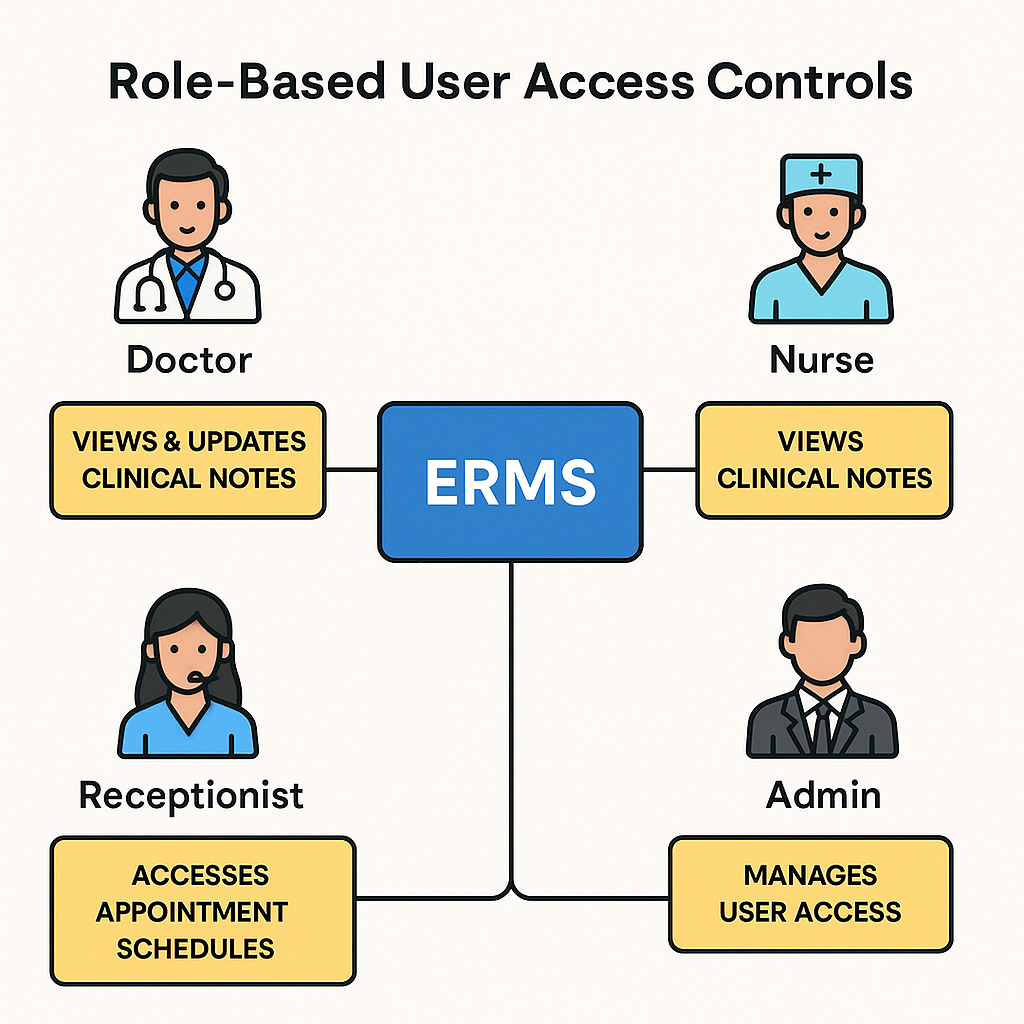 Role-Based User Access Controls (RBAC) is a core security feature of ERMS that ensures the right people have access to the right information—nothing more, nothing less. Each user in the system is assigned a role (such as doctor, nurse, receptionist, lab technician, or admin), and their access is limited to only the data and functions necessary for their responsibilities.This approach helps hospitals maintain strict data confidentiality, patient safety, and workflow efficiency through: